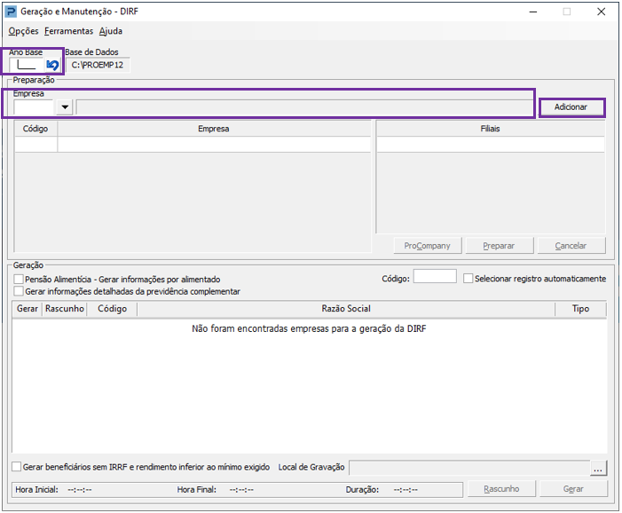 2- Informe o Ano Base e o Código da Empresa. Caso deseje gerar o arquivo para mais de uma empresa, deixe o campo em branco, em seguida clique em Adicionar.