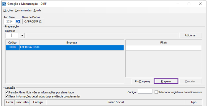 3- A empresa é demonstrada na grade, clique em Preparar.