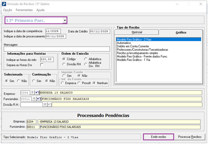2- Realize o processamento dos Recibos de Primeira Parcela 13° Salário.