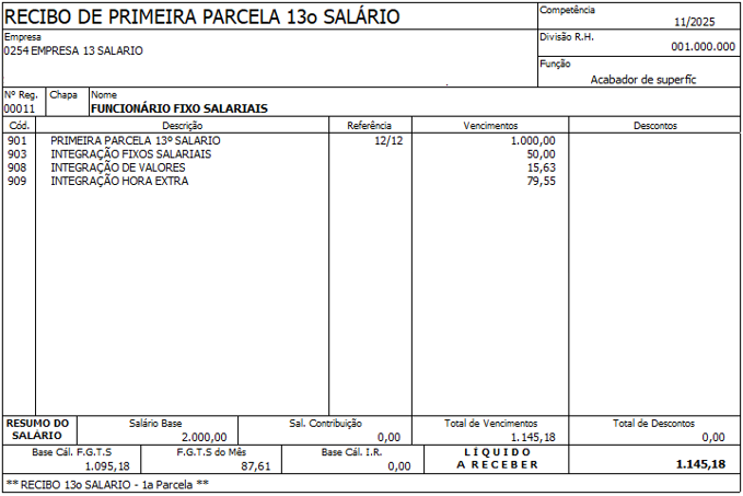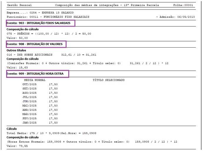 6- Ao visualizar o relatório, serão apresentados os cálculos das Integrações, de acordo com os Eventos calculados no Recibo de Primeira Parcela de 13º Salário.