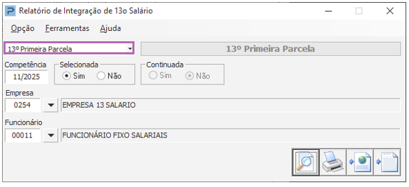 3- Realize a geração do Relatório de Integração, informando a opção 13º Primeira Parcela e a competência de processamento dos Recibos.