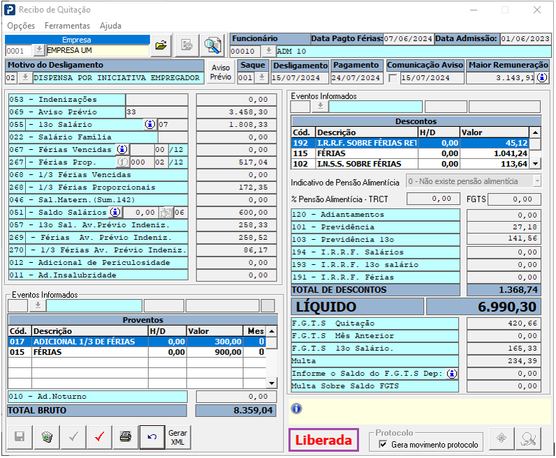 1- Após informar o período e solicitar o processamento, são apresentadas todas as empresas e funcionários com Recibo de Quitação com Motivo de Desligamento parametrizado para geração do Comunicado de Dispensa.