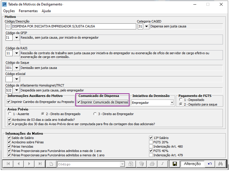 4- O Motivo utilizado para desligamento do Funcionário deve estar com a opção "Imprimir Comunicado de Dispensa" selecionada, pois do contrário o Funcionário não será demonstrado na grade para geração Comunicado.