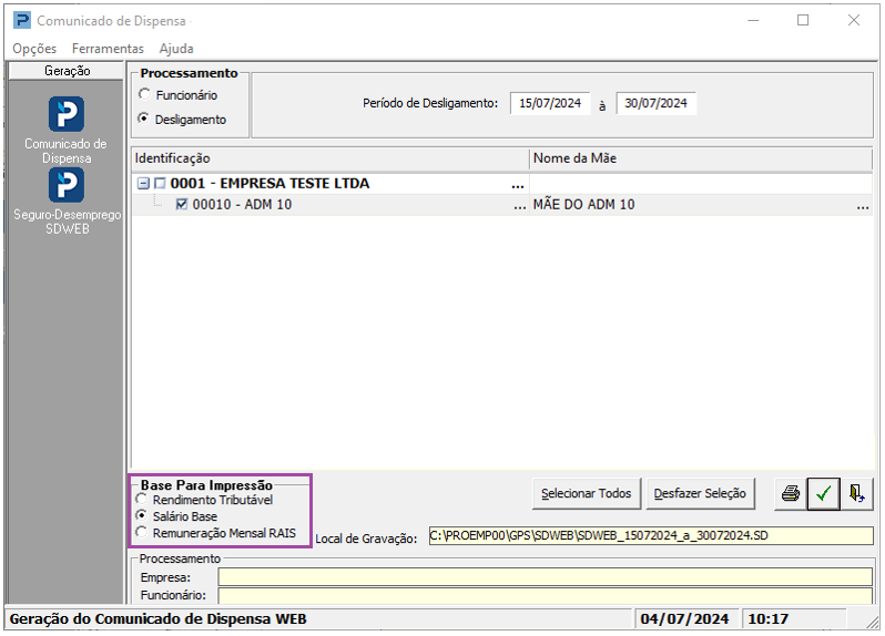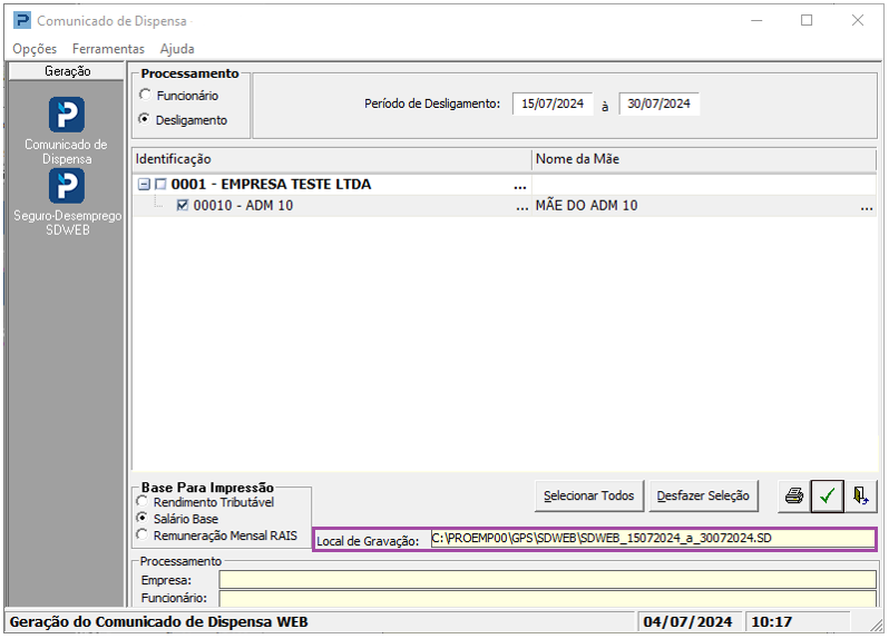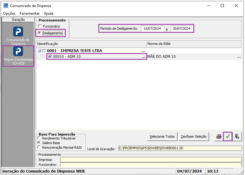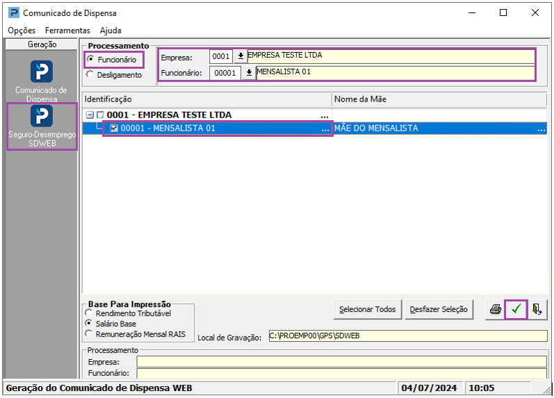 6- O Arquivo SDWEB pode ser gerado de duas formas: por seleção de Funcionário ou por data de Desligamento.