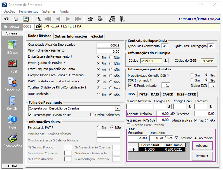 1- Acesse: Parâmetros Gerais > Cadastros > Cadastro de Empresas > Aba Trabalhista > Guia Dados básicos > Sub guia INSS.