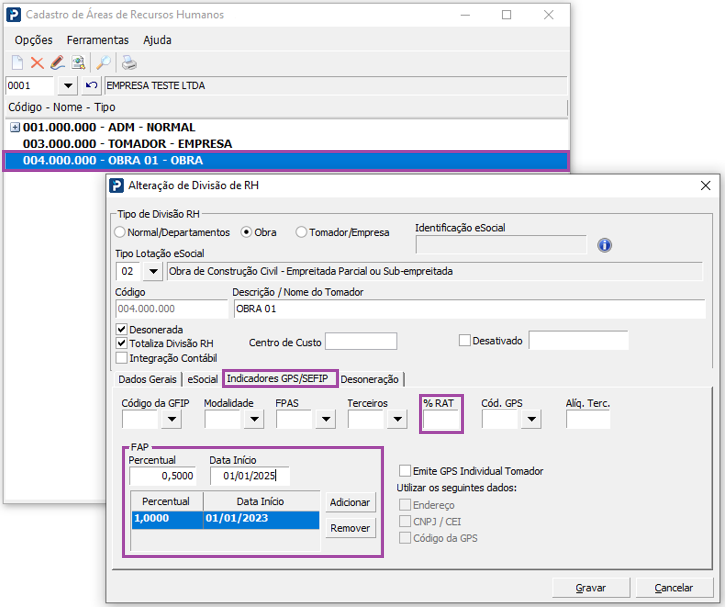 Observação: Apenas divisões obra e tomador/empresa, possuem os campos próprios para o preenchimento do FAP e data inicio no Cadastro de área de recursos humanos.