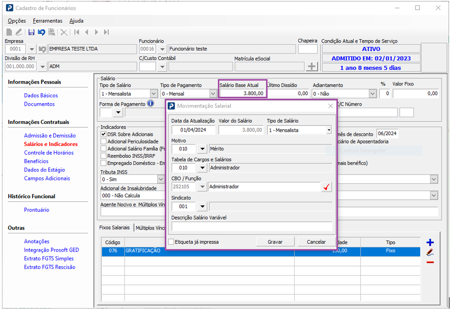 Isso ocorre pois ao salvar o Cadastro de Funcionários após a alteração salarial, deveria ter sido preenchido a tela 'Movimentação Salarial' para registro de histórico: