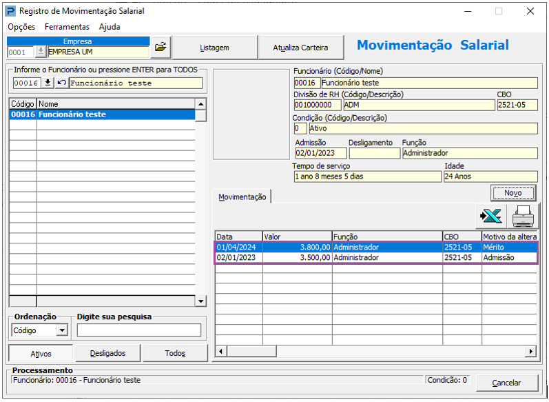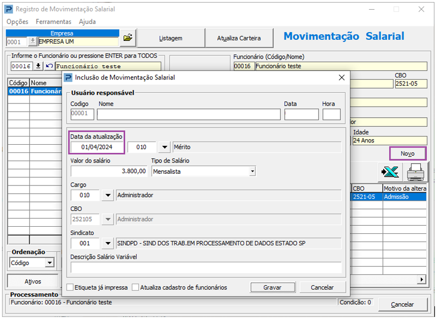 Dessa forma, para informar o histórico de movimentação salarial para o funcionário, selecione a opção "Novo" e informe a data da atualização e grave.