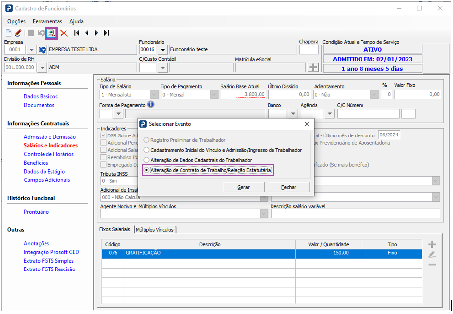 Caso seja necessário o envio do evento S-2206 para alteração salarial é necessário clicar na opção "Gerar XML" e selecionar a opção "Alteração de Contrato de Trabalho/Relação Estatutária
