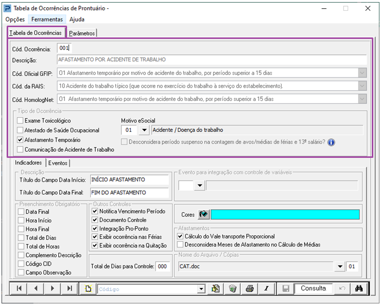 2- Na aba Parâmetros deve ser relacionado a ocorrência cadastrada na tabela de ocorrências.