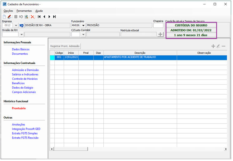 No cadastro de funcionário, aba prontuário deve existir o afastamento e a condição do funcionário deve ser apresentada como custódia do seguro.