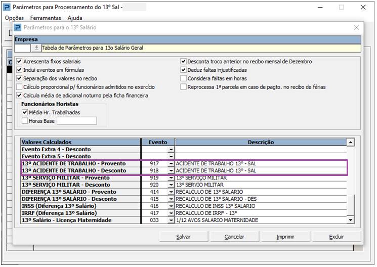 No campo 13° acidente de trabalho provento/desconto, devem ser informados os respectivos eventos, caso não tenha poderá criar na Tabela de Eventos.