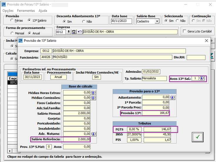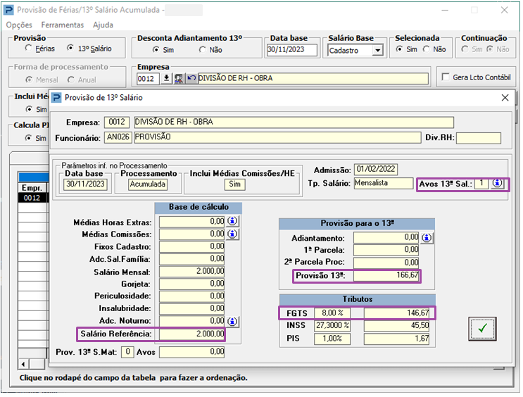 Neste exemplo o funcionário se afastou em 17/01/19. Na provisão será demonstrado os avos de direito e o FGTS será calculado de acordo com a data base informada.