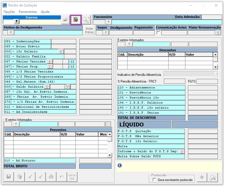 2- Realizar a conferência dos Eventos informados nos Parâmetros da Quitação, pois estes também devem estar parametrizados corretamente.