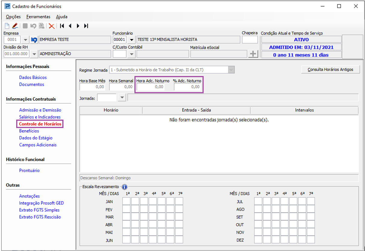 2- Na Aba Controle de Horários, caso o funcionário trabalhe mensalmente uma quantidade de horas fixa de adicional noturno pode preencher neste campo.