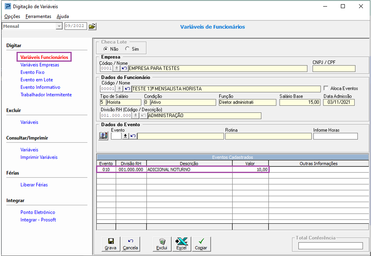 2- Para funcionários com horas de adicional noturno variável, deve informar as horas na digitação de variáveis.