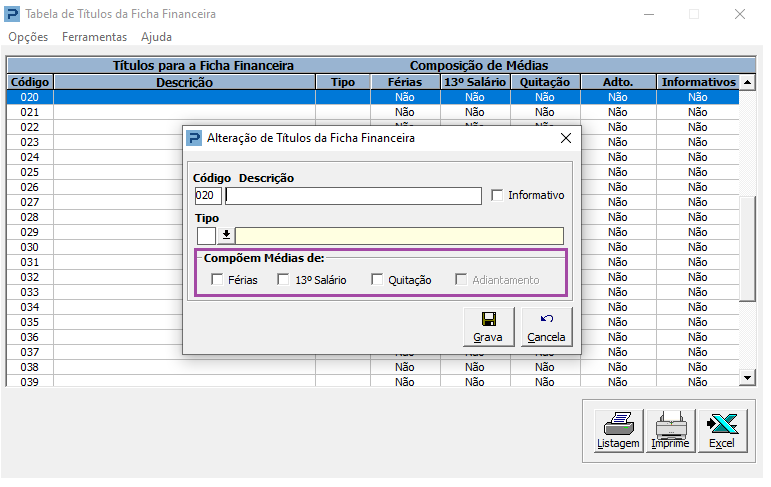 2- Através desta tabela, o usuário poderá definir os títulos que irão compor a ficha financeira dos funcionários para compor as médias de provisões de férias e 13º salário: