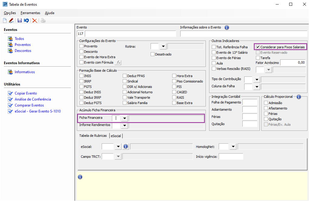 2- Esta tabela consiste em um conjunto de informações onde são definidos os parâmetros de cada evento. Podemos afirmar que esta é uma das principais tabelas do sistema, pois são através dos indicadores desses eventos que serão efetuados os cálculos nos recibos de pagamento, desta forma, todos os indicadores são extremamente importantes e influenciam diretamente nos resultados dos processamentos efetuados pelo programa.