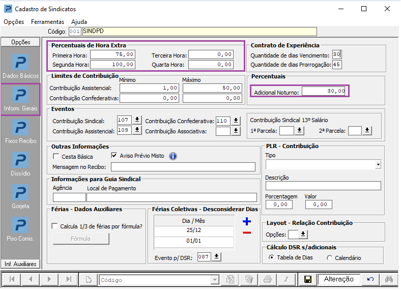 Percentual de adicional noturno: Informe o percentual conforme determinação do sindicato através de convenção coletiva.