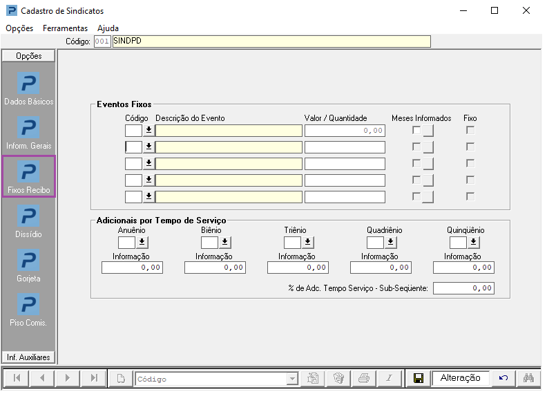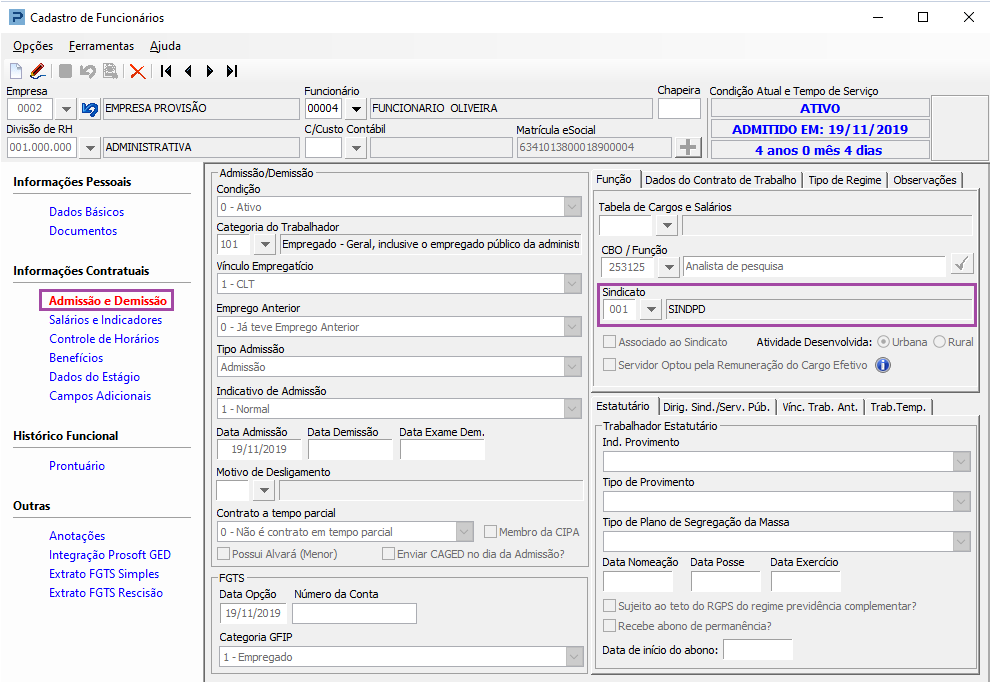 Sindicato: Informar o código do sindicato de acordo com a categoria que o funcionário pertence. Essa informação é de fundamental importância, pois existem vários parâmetros no cadastro de sindicato que o programa utiliza para efetuar os cálculos das provisões de férias e 13º salário.