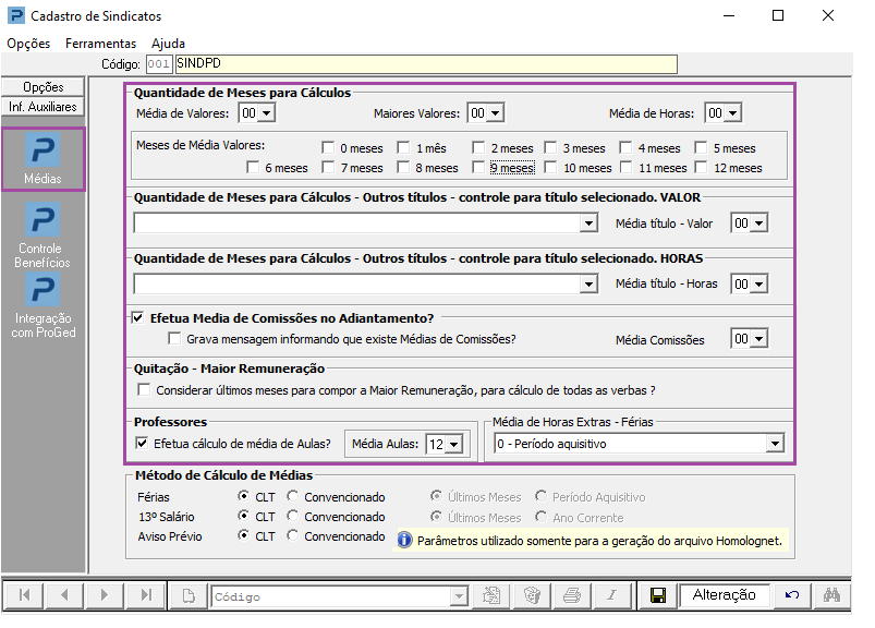 Média de Horas Extras: Informar a  quantidade  de meses  a  ser  utilizado  para  o cálculo de média de horas extras, conforme determinação do sindicato.