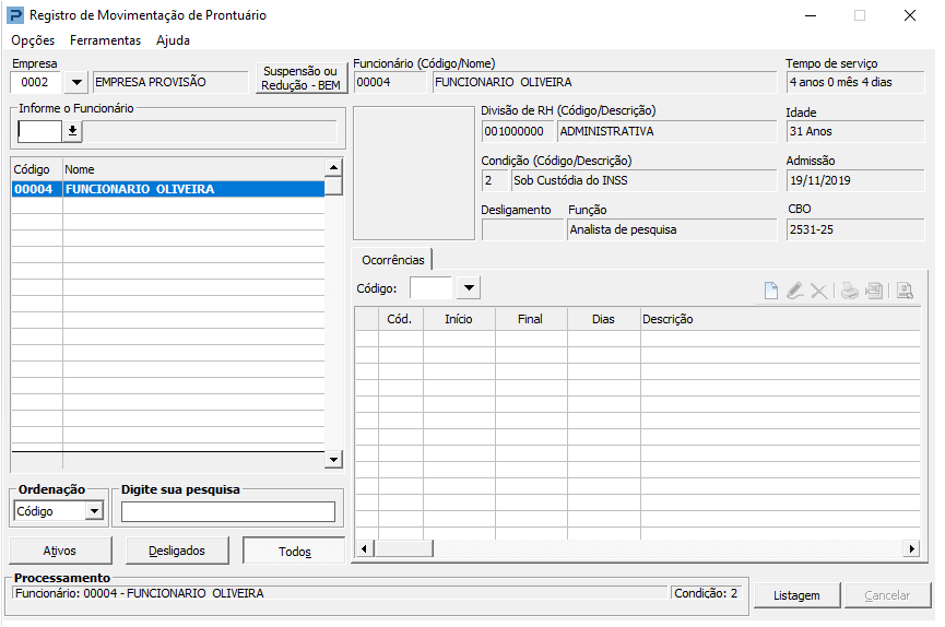2- Esta rotina tem como finalidade, permitir ao usuário controlar e registrar todas as ocorrências dos funcionários. Deverão ser registrados obrigatoriamente os afastamentos que devem ser declarados na GFIP com o respectivo código de movimentação oficial, exemplo: afastamento por motivo de acidente de trabalho, doença, licença maternidade, exército, entre outros. A partir destes registros que serão gravados que o sistema irá efetuar o controle de perda de avos no 13º salário e a perda do período aquisitivo de férias que irá influência diretamente no cálculo das provisões.