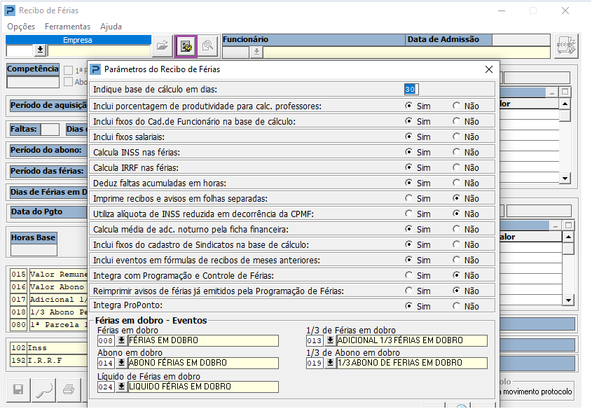 Fixos recibo: Nessa opção será considerado para a provisão de férias e 13º salário, apenas os eventos tipo provento que estiverem com seus parâmetros corretos na tabela de eventos e nos parâmetros de férias e 13º salário, incluindo o adicional por tempo de serviço.