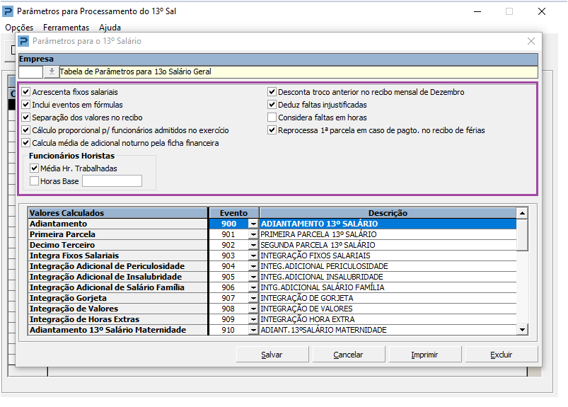 Inclui eventos em fórmulas: Este parâmetro tem como objetivo, incluir os eventos em fórmula na maior remuneração da provisão de 13º salário.