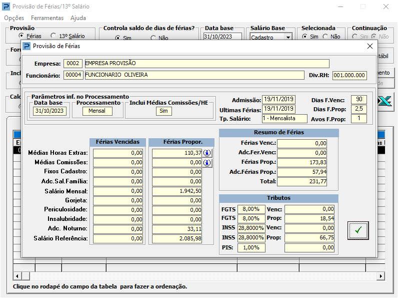 Ao gerar a provisão, com duplo clique sobre o funcionário é possível visualizar a média apurada para o funcionário, valor este que será somado ao salário do funcionário.