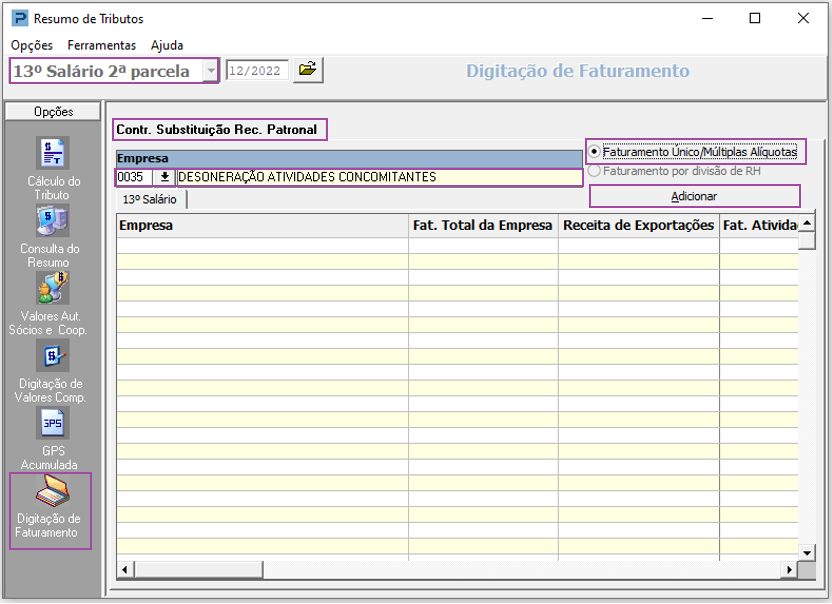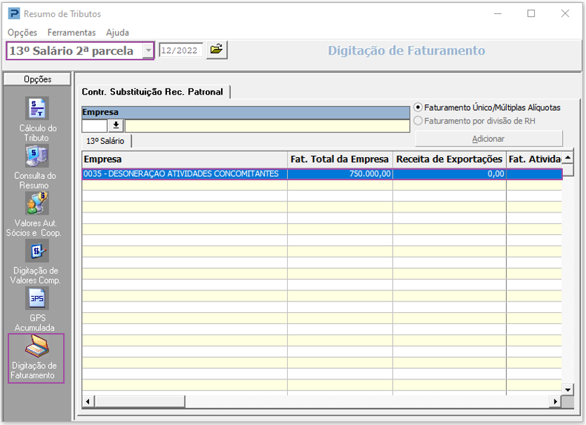 2- Acesse a Aba Digitação de Faturamento do Resumo de Tributos da Segunda Parcela de 13º Salário.