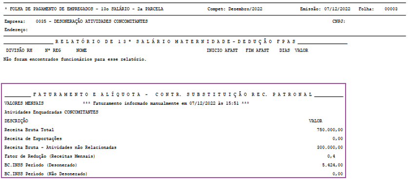 Nota: As informações das imagens são apenas um exemplo. Para obter sucesso no procedimento utilize os dados de sua empresa. Na Folha de 13º salário não há emissão de DARF Contr. Prev. Sobre Receita Bruta - Substituição Rec. Patronal. Para apuração do Período Desonerado e Não Desonerado de 13° Salário, além da data início e final de enquadramento da empresa na desoneração, será considerado o período de alocação dos funcionários no exercício (empresas que trabalham com divisão de RH).