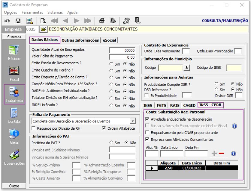 1- Acesse: Parâmetros Gerais > Cadastros > Cadastros de Empresas > Aba Trabalhista > Aba INSS – CPRB