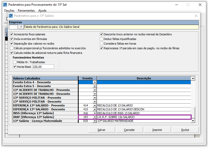 3- Nos parâmetros deverão ser informados eventos exclusivos para o cálculo do 13º salário. Cadastre novos eventos de 13º Salário e vincule no lugar de onde excluiu.
