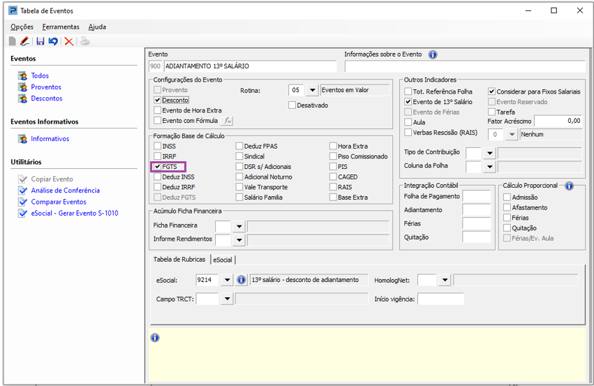 2- Verifique se o Evento utilizado para pagamento do Adiantamento de 13º Salário está parametrizado com o indicador FGTS.