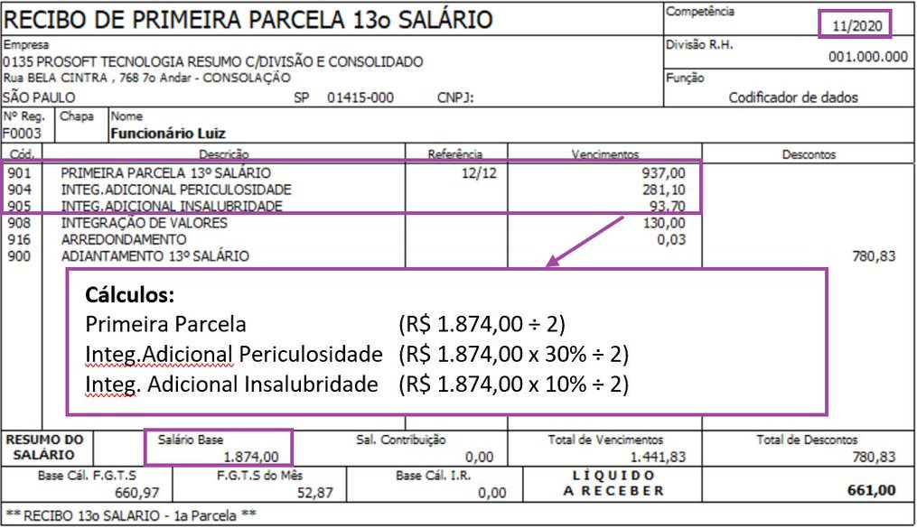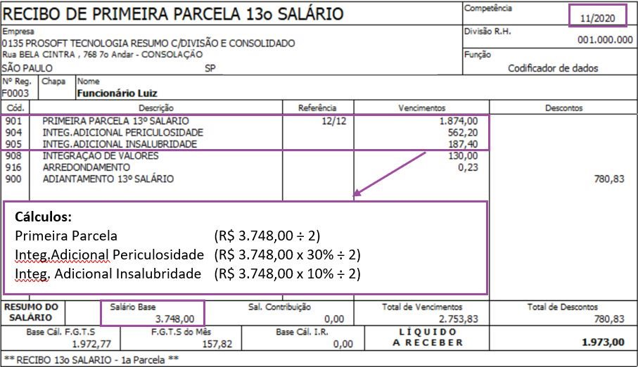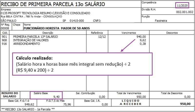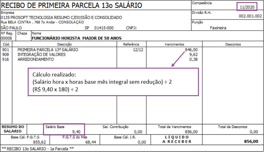 Exemplo: No mês de Novembro foi processado o recibo de 1ª parcela do 13º Salário e neste período o funcionário ainda está com a jornada e salário reduzidos, deste modo quando solicitado o processamento do Recibo de 13º na competência 11/2020 e informar que deseja considerar o salário integral sem redução a 1ª parcela será calculada com base no salário gravado na ocorrência do prontuário: