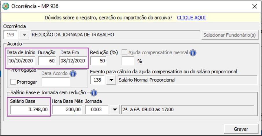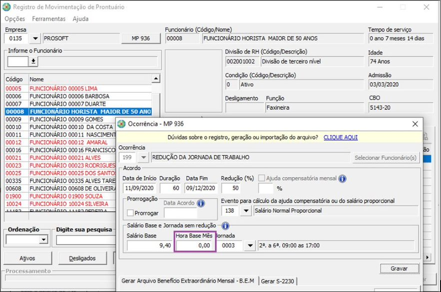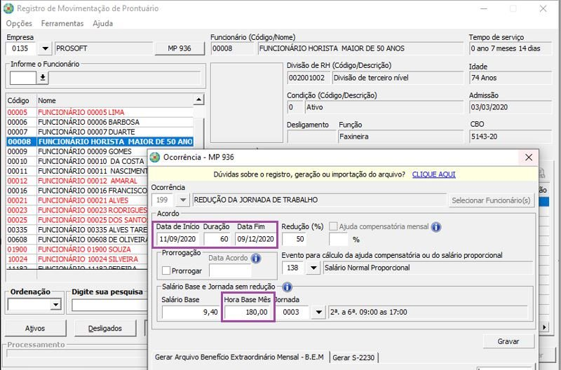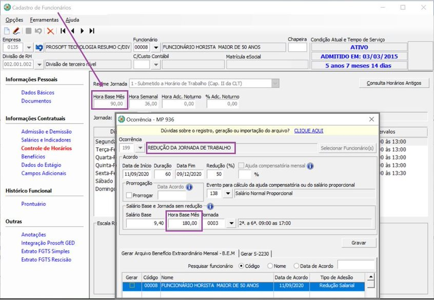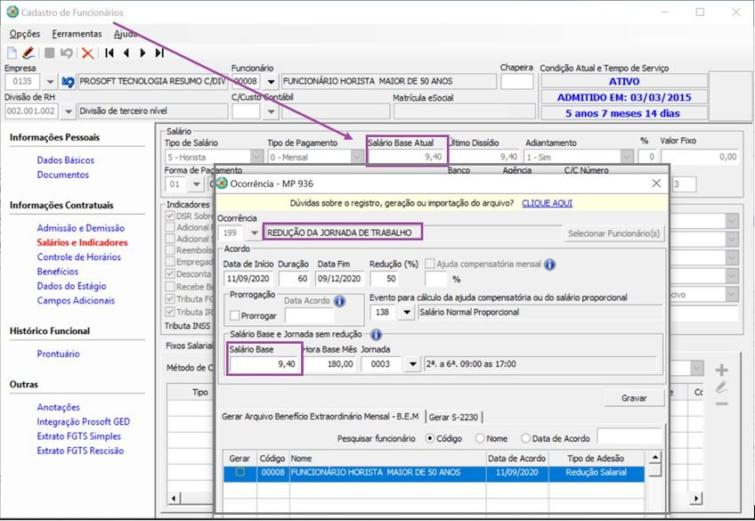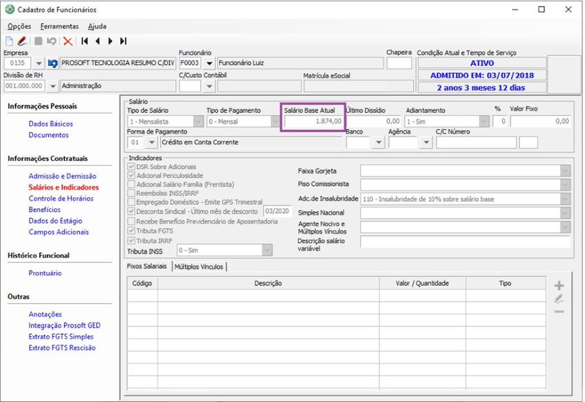 Ressalta-se que quando o salário base é por hora, havendo Acordo de Redução de Jornada e Salário o que será modificado no cadastro do funcionário é apenas quantidade de horas base mês, logo o valor do salário base gravado no prontuário será o mesmo que o constante no cadastro do funcionário: