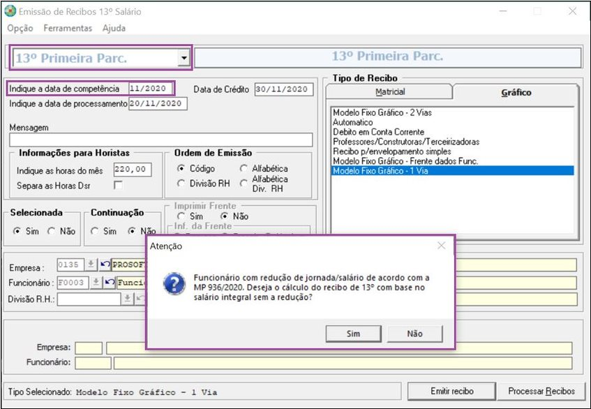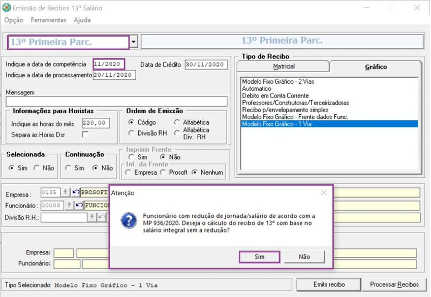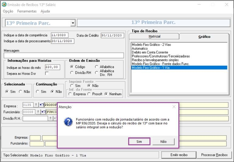 Havendo Acordo de Redução de Jornada e Salário vigente na competência de processamento de qualquer das parcelas do 13º Salário, ao confirmar a emissão e/ou processamento do recibo deverá ser indicado qual salário base deve ser considerado para no cálculo sendo, salário integral sem redução ou salário reduzido: