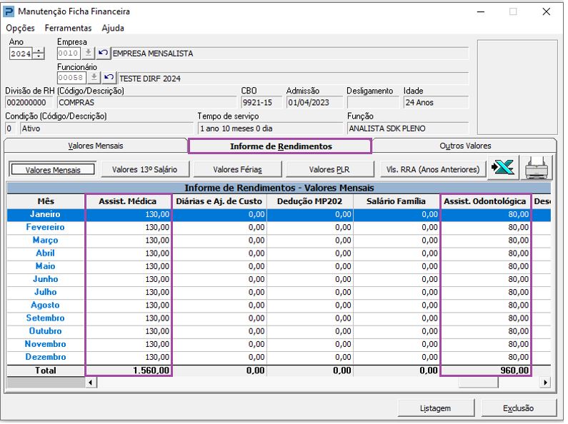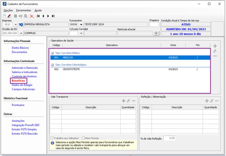 2- Acesse a Aba Benefícios e certifique-se de que o Funcionário possui Assistência Médica e/ou Odontológica vinculadas