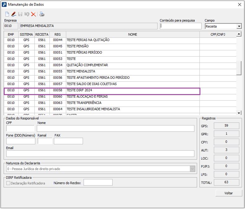 1- Acesse Parâmetros Gerais> Emissão de Guias e Relatórios Legais> DIRF > Geração e Manutenção da DIRF