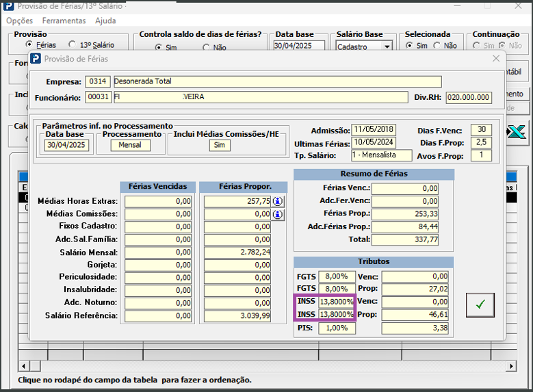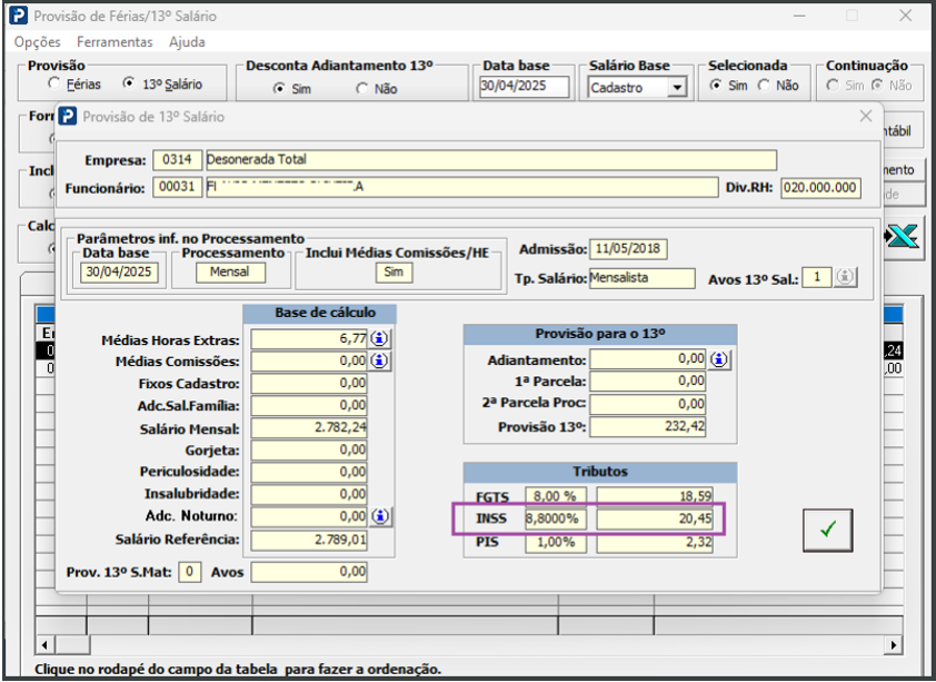 5- Ao visualizar a provisão os valores são apresentados separadamente.