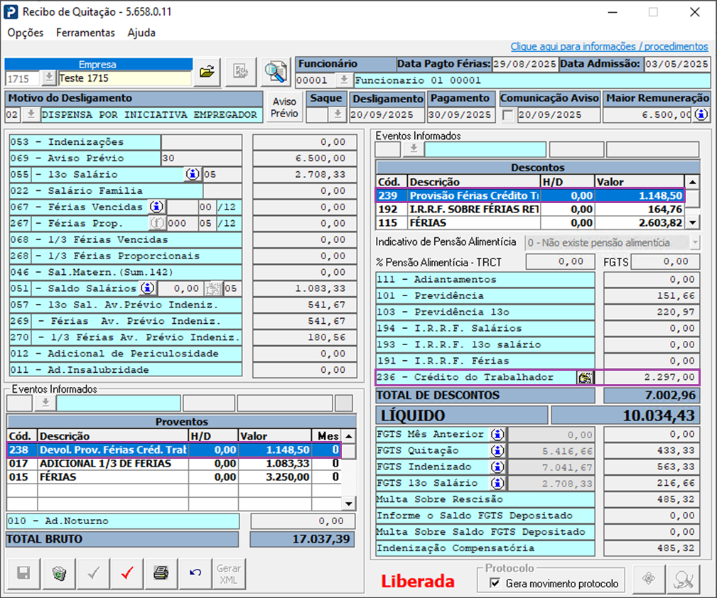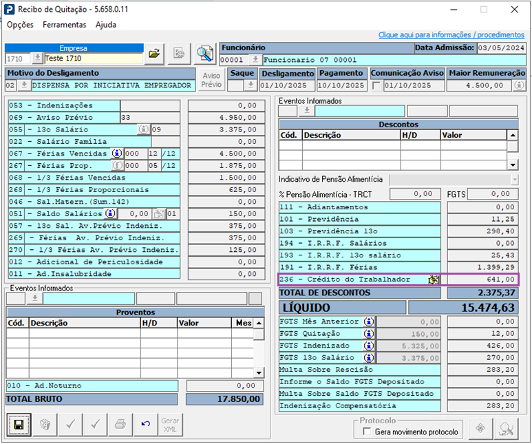 8- Neste exemplo o trabalhador recebeu adiantamento com o "Provisionamento do crédito do trabalhador" o evento foi devolvido no gride de proventos, o adiantamento foi descontado na quitação, e o valor do desconto do crédito do trabalhador foi realizado na quitação no campo “ Empréstimo Credito do Trabalhador” de descontos.