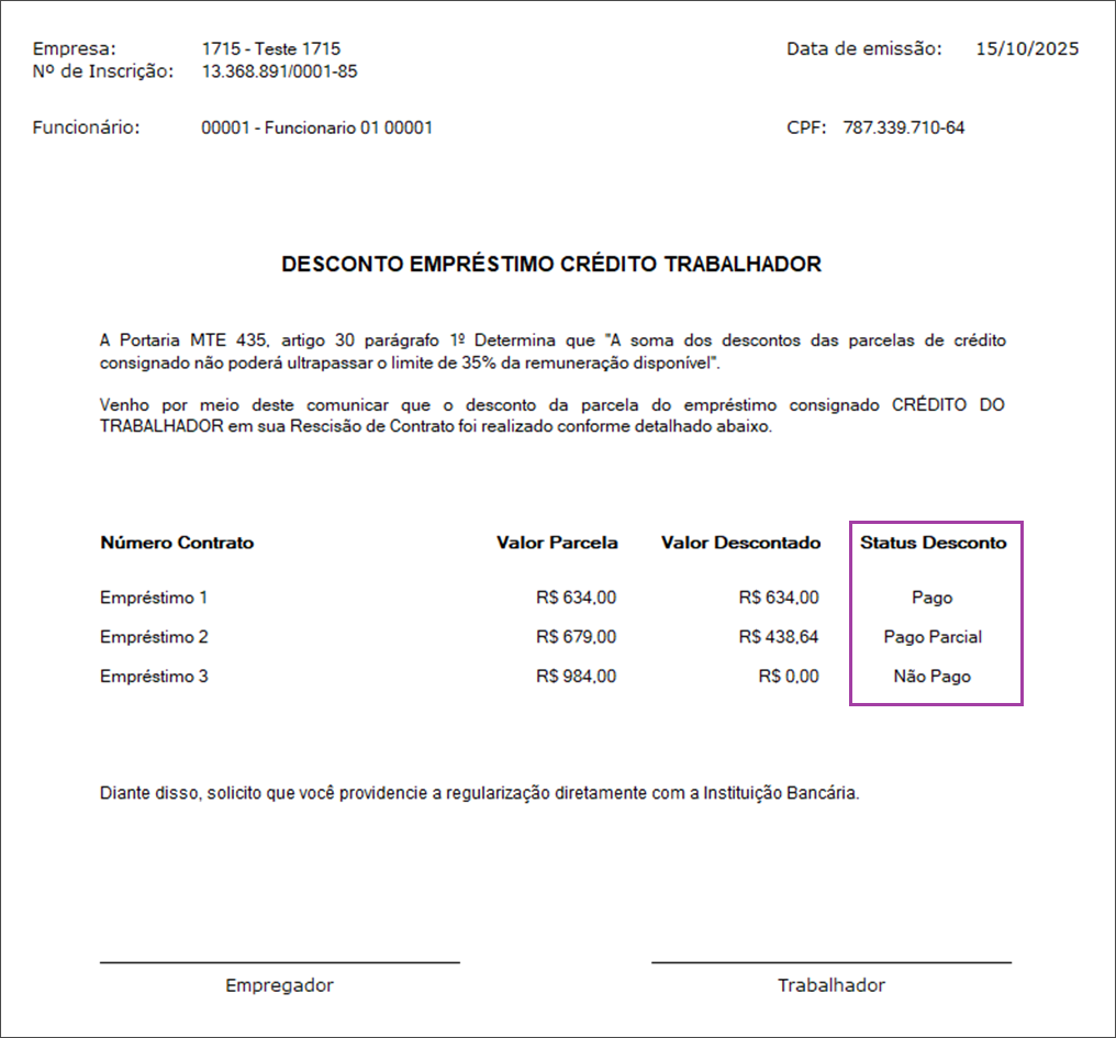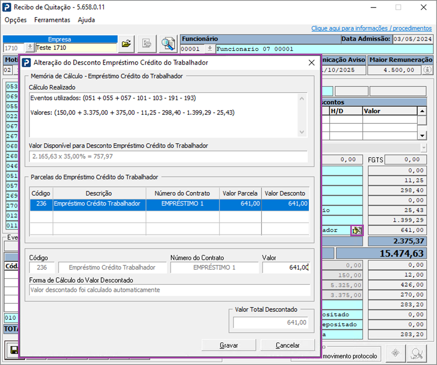 Neste caso, 757,97 será o valor disponível para desconto do Empréstimo do Crédito do Trabalhador para este funcionário, e será o valor máximo permitido para desconto na quitação gerada.