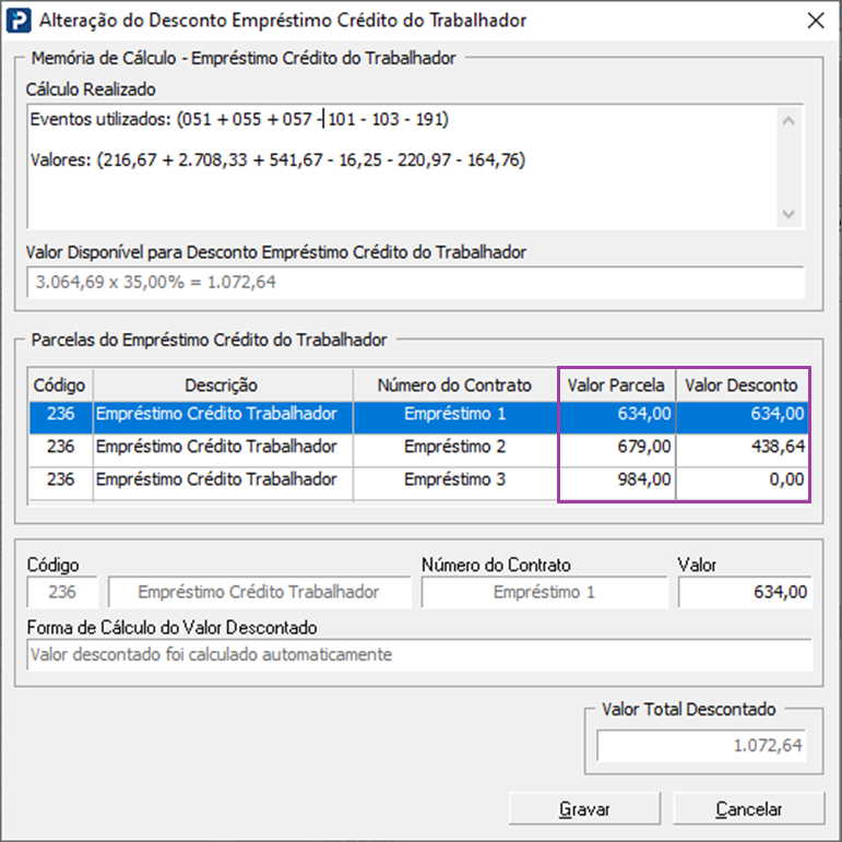 Portanto, 1.072,64 será o valor disponível para desconto do Empréstimo do Crédito do Trabalhador para este funcionário.