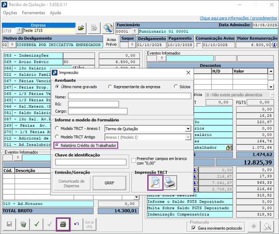 Ao realizar o desligamento de um Funcionário, que possui a contratação do empréstimo na modalidade Crédito do Trabalhador, o valor da parcela será automaticamente apresentado no Recibo de Quitação, conforme demonstração dos procedimentos abaixo.
