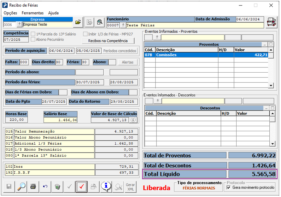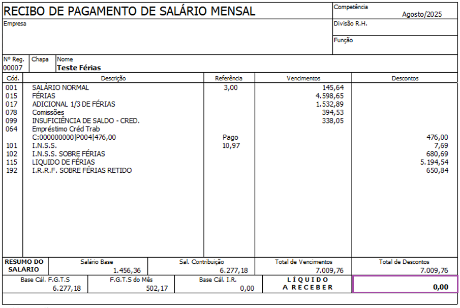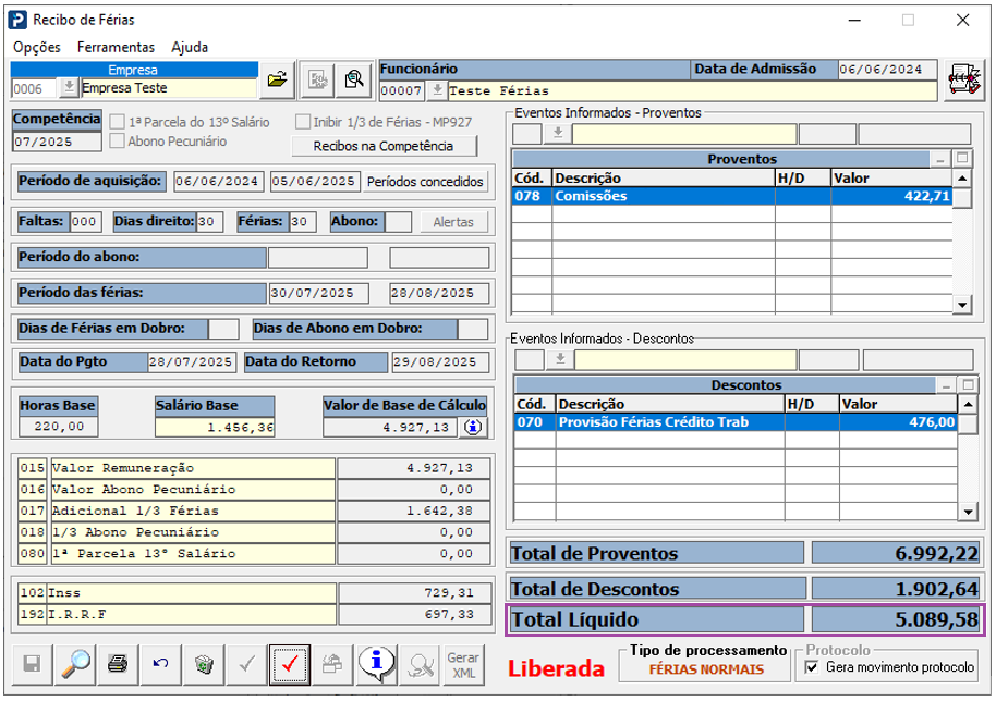 Neste caso, estamos tratando de férias particionadas, ou seja, as férias foram divididas em dois períodos diferentes. Por esse motivo, o valor líquido do mês de agosto também é importante para a correta interpretação do pagamento.