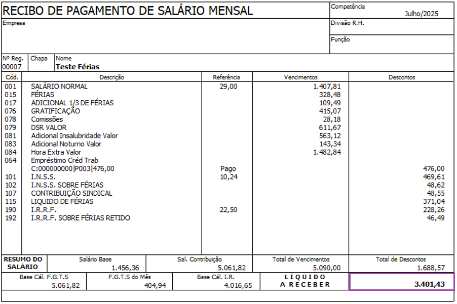 Líquido Salário Mensal (07/2025): R$ 3.401,43