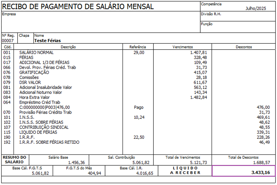 Líquido Salário Mensal (07/2025): R$ 3.433,16