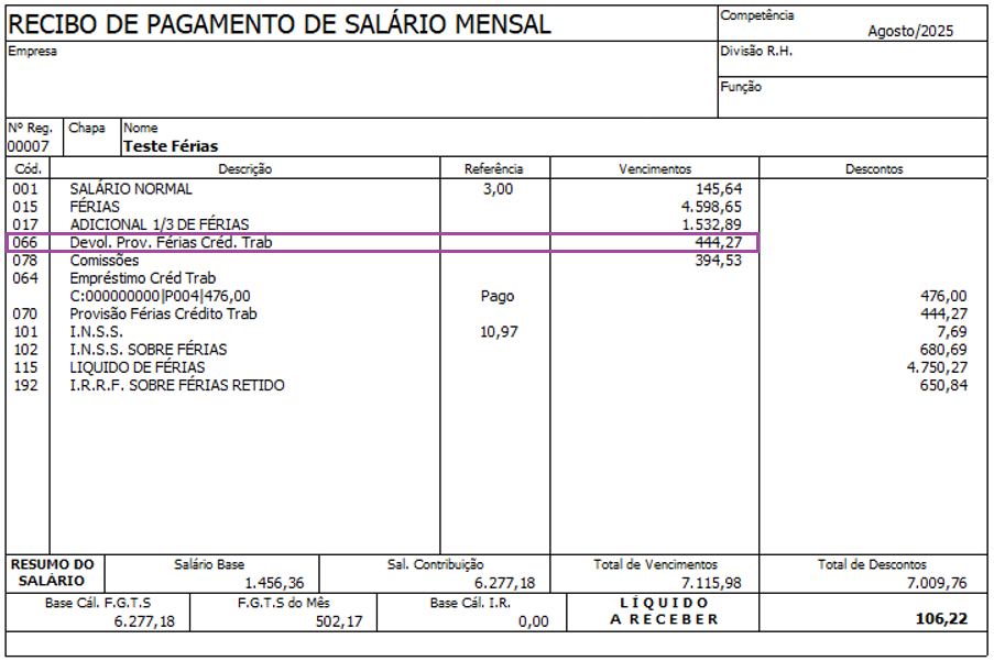 Importante: Este valor não é um desconto efetivo nas férias. Ele será efetivamente descontado no recibo mensal, e o valor que foi “reservado” será devolvido no mesmo recibo, garantindo o equilíbrio das verbas.