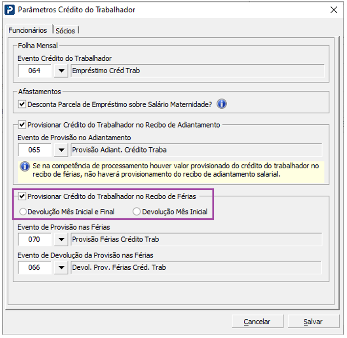 3- Selecione o parâmetro “Provisionar Crédito do Trabalhador no Recibo de Férias” e, em seguida, escolha a opção desejada 'Devolução no mês inicial e final' ou 'Devolução no mês inicial'