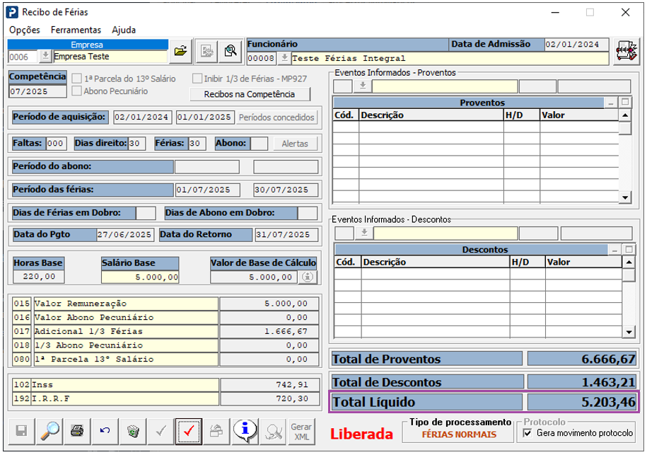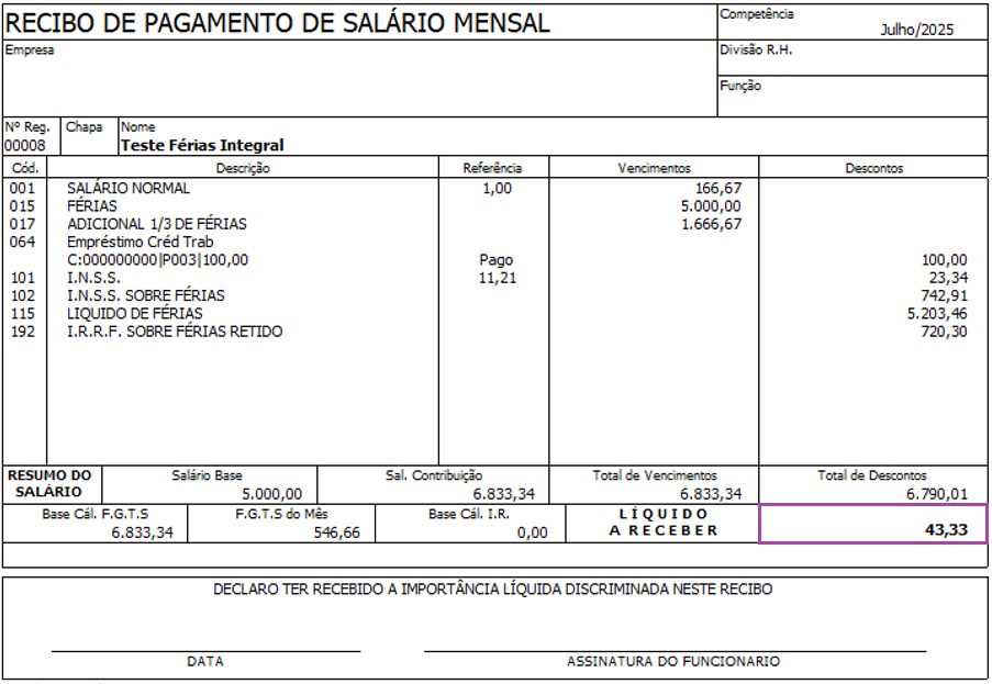 É possível verificar que o colaborador recebeu R$ 5.246,79 no mês de julho de 2025, considerando o recibo com provisionamento. Ou seja, o valor final recebido pelo colaborador permanece o mesmo, com ou sem provisionamento.